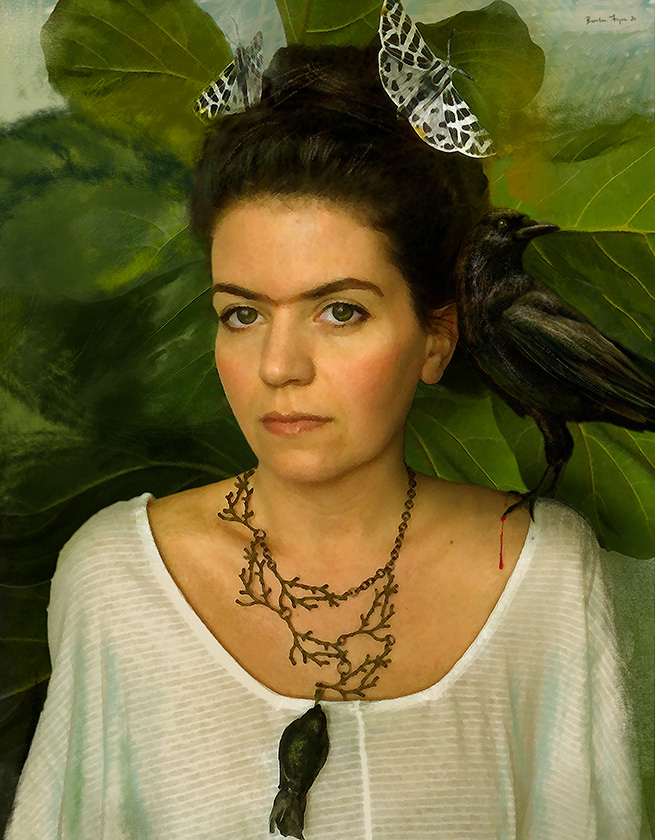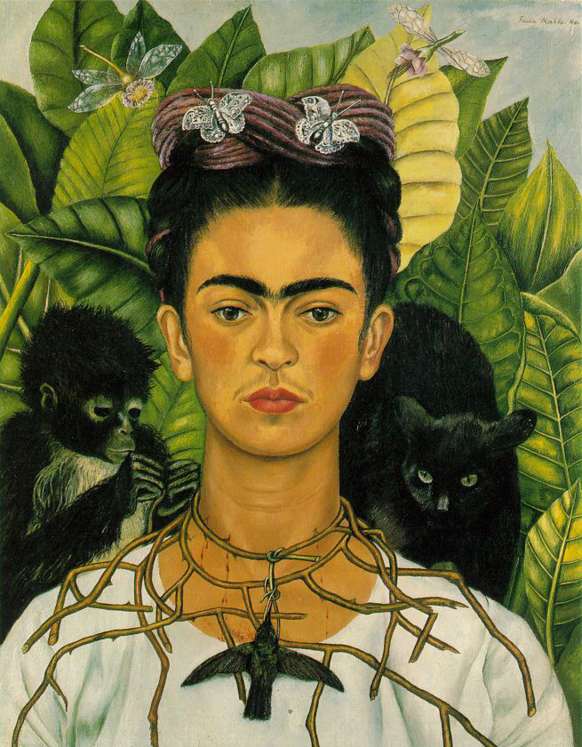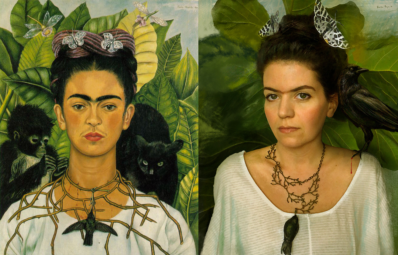 A self-portrait in homage to Frida Kahlo's "Self-Portrait with Thorn Necklace and Hummingbird"